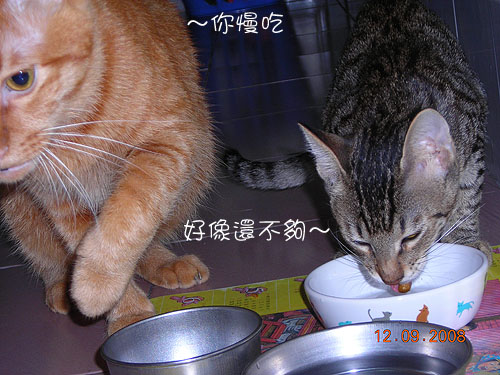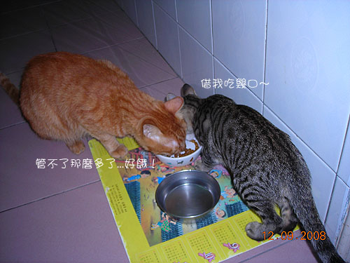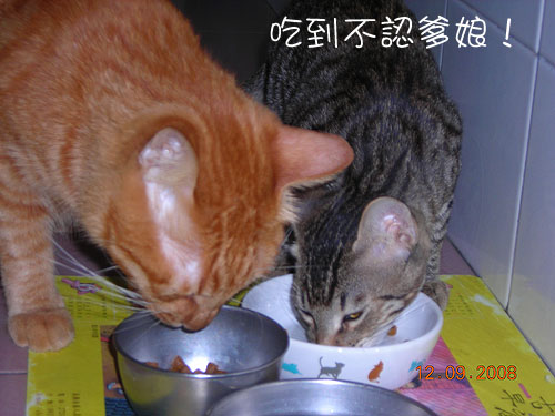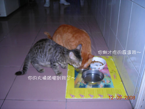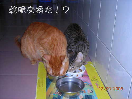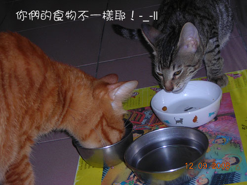 小虎吃的是幼貓配方。Angelino早就已經換成成貓配方。結果兩個人還這樣交換吃。