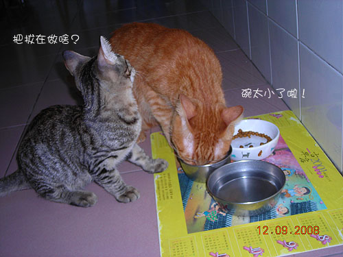 隔天早上怕他們又交換吃,所幸兩個碗裡幼貓跟成貓飼料都各放一半...