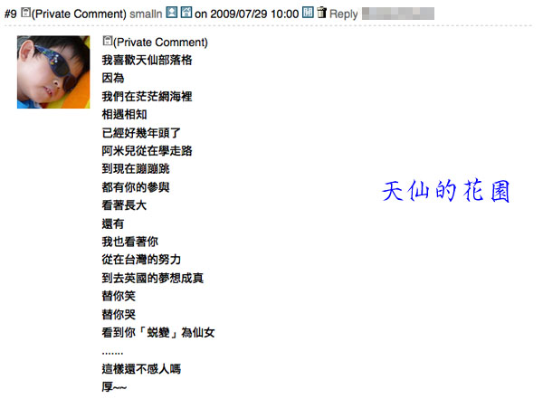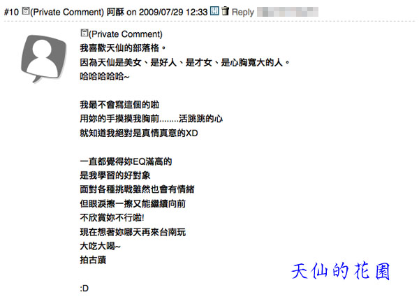天仙念:第一篇文章中的留言,除了兩篇具有比較私人的訊息無法開放之外其他都開放了喔!再次感謝大家。