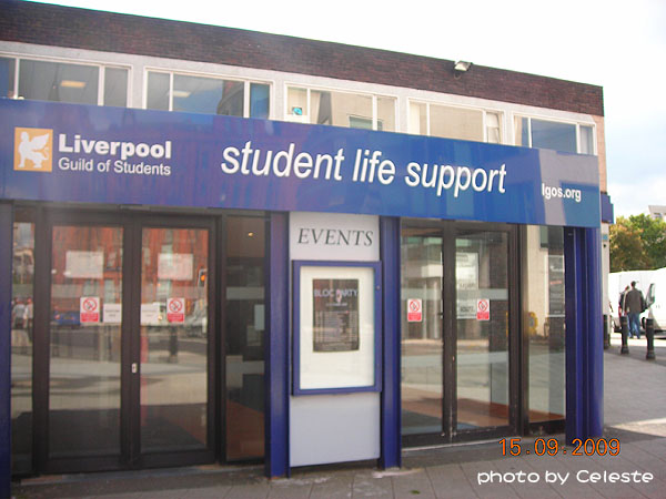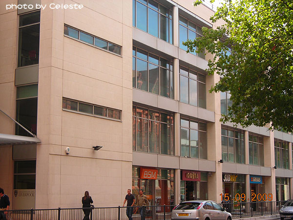 這就是我們的系館。一個簡單的建築物。越洋跨海來利物浦唸書的同學中應該有很多人在看到這棟建築物後會感到非常失望吧?不過你覺得我們會忌妒像商學院有的那些比較嶄新的建築以及設施嗎?我無法代表全數,不過至少我不會。我們學文的人,就跟傳言一樣,把我們丟進一個房間,放幾本書,幾張椅子跟桌子,接著就會自動運轉。