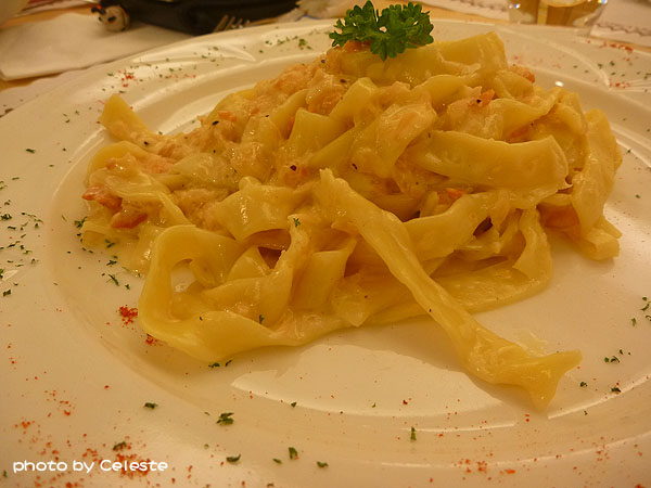 橙醬鮭魚麵。據說是有點甜(所以奇怪)