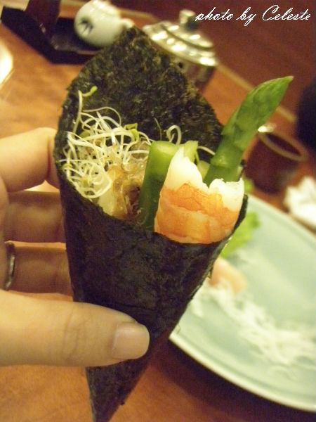 The waitress will kindly remind you to have this first, as the mayo in teh temaki will soften the seaweed, and ruin the crunchiness. (Be sure to inform them beforehand if you do not wish to have mayo in your temaki)