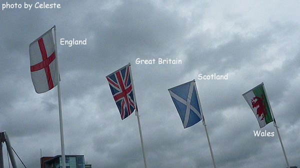 大不列顛不同的國旗 (右到左:英格蘭,大不列顛,蘇格蘭,威爾斯)