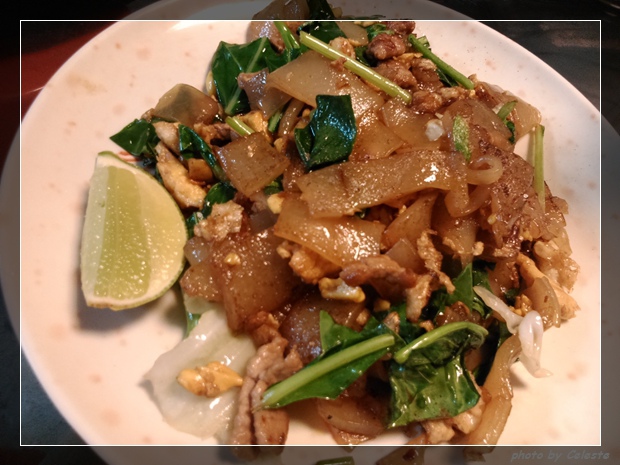 注意喔!這道跟大家所知道的"泰式炒河粉"(pad thai)不一樣!這款炒河粉是用醬油拿來炒的。基本上,味道是不錯(因為有附檸檬,淋上檸檬什麼都好吃!!)只是前面說過,這裡的板條都是用台灣的,口感實在有點突兀。