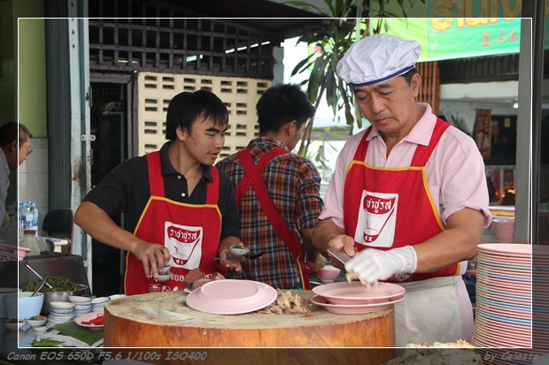 這一間小小的店,卻有好幾位員工。忙碌的時候大家都忙翻了。戴著帽子的就一直切切切~