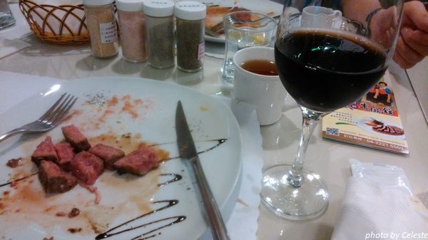 奢侈的點了一杯紅酒配牛排。