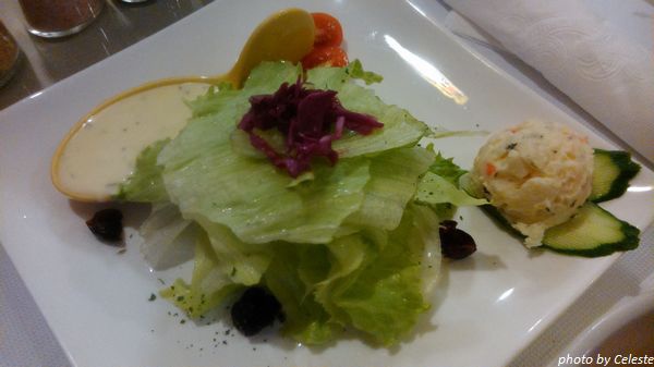 首先登場的是清爽的沙拉。看到附上的醬汁是擺在小碗裡面的就感到欣慰(天仙對沙拉的醬汁有點挑...)